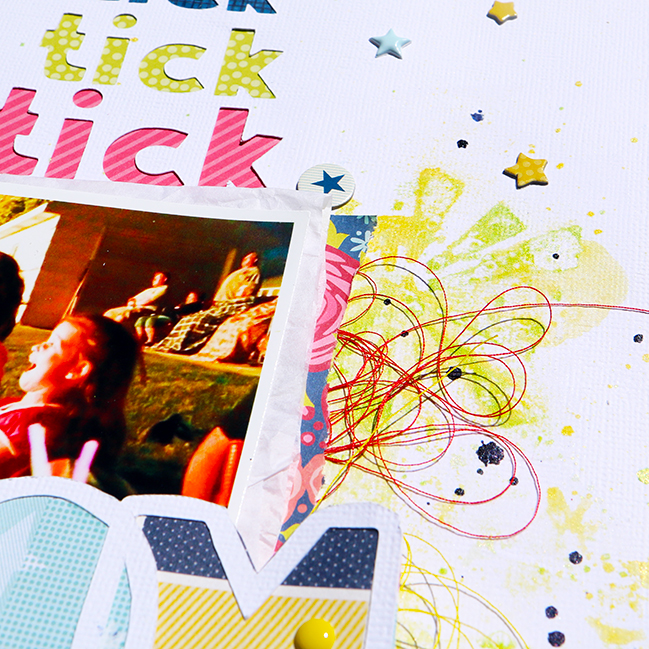 I used the branding strips off several of the 12x12 papers on the left of side of the layout to add some splashes of color. I combined the Thickers and a chipboard sticker for my title.