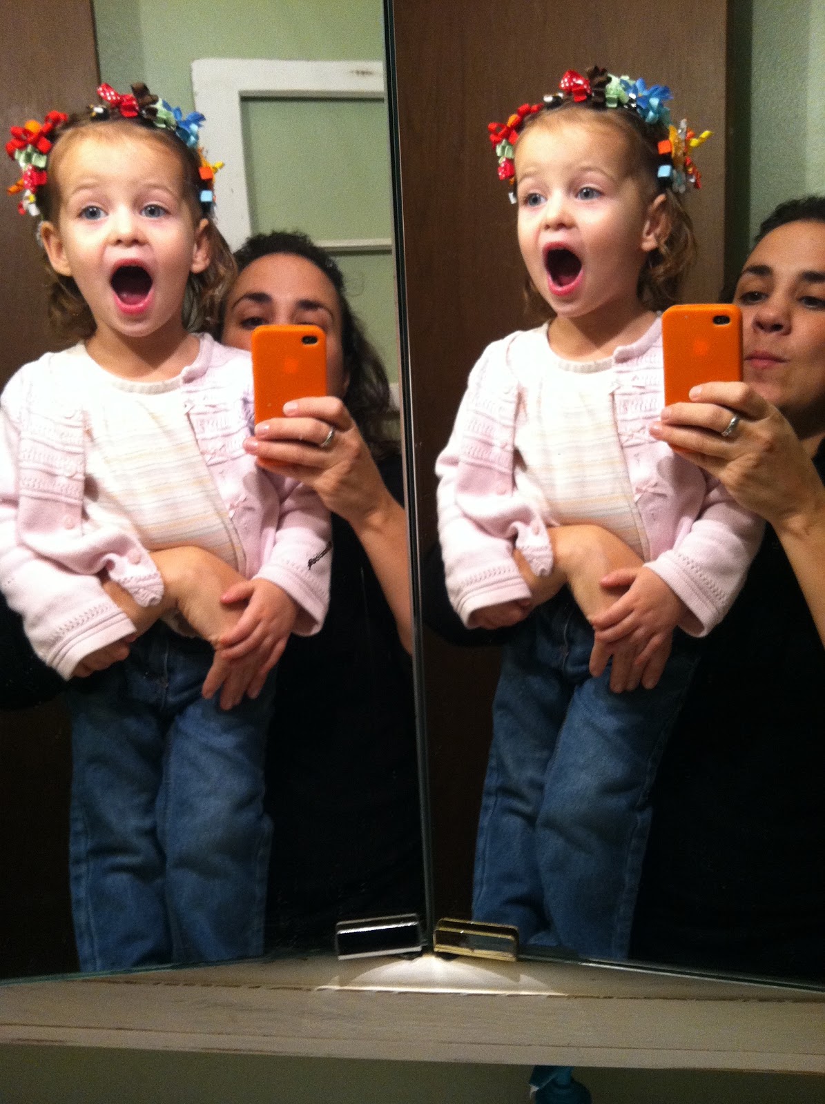 But my favorite photo of the day is this one that I took with my iPhone.  While we were trying to cook supper, B. insisted on putting just about every "pretty" that she owns in her hair at the same time.  This isn't the first time she's done this, but it's been a while.  Then she wanted to see herself in the mirror.  I liked the way you could see two of each of us, at different angles, because the doors to the medicine cabinet were open slightly.  So, I had to take this photo.  Fun!