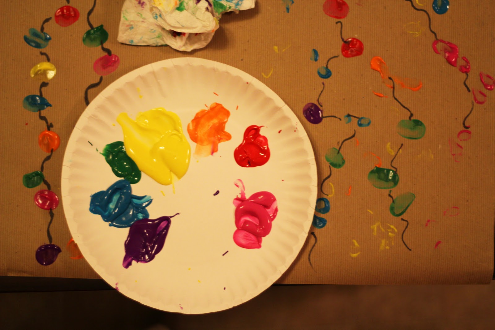 Last night, B and I made wrapping paper together!  I'm thinking we will use it to wrap presents for daycare and maybe grandparents.  I purchased some kraft wrapping paper at Target (which wasn't exactly easy to find, but I found it).  Then she stripped down to her diaper and got busy!  I showed her how to use her thumb to make holiday lights.  After painting I drew lines to connect the lights.  Although this was a December Eve activity, it just might make the December Daily album!