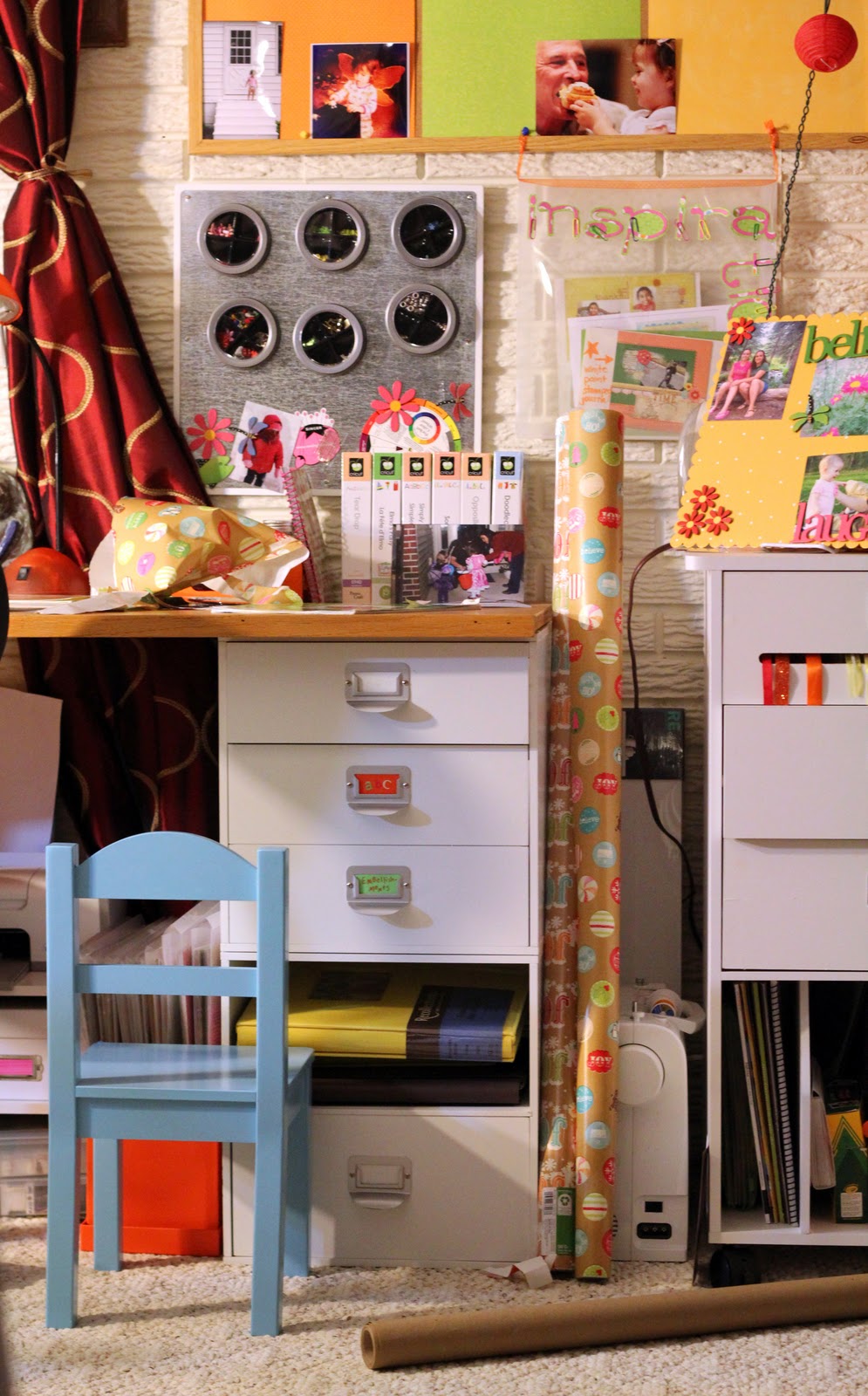 I don't like the way I blend in with the chair, making my butt look extra large...but overall, I like the photo and you can see the space a bit better.  The clear envelope is just under the bulletin board, hanging from it with a ribbon.  Now the bulletin board is ready for other bits of inspiration and photos!