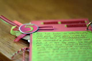I decided to hide my journaling behind the photo on this page. I did this for a couple of reason. The biggest reason was because I wanted a bit of white (green) space. A bonus was that it helped to hide the number five on the next page (since it sticks out). I wouldn't have liked seeing the back of the number 5 and would've felt like I had to cover it up! Here's the hidden journal...