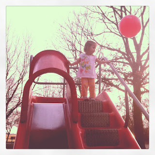 This is actually a two page spread with a little insert (another way to get in a few more photos of this first day of the park season).  The left side is just an instagram iPhone photo printed 6x6 with an added sticker from one of my scrapbook circle kits.  I used a filter on the photo to make it look older (the filter is called 1977 and its included right in instagram).  I liked this photo because my soul mate threw the ball to B, and I took the photo just in time to catch it in the air.  I think it looks like a red balloon.  The right side is just two more photos from the red slide (she loved it that day).  I sewed on a "play" flash card from October Afternoon (Sidewalks) and some small alpha stickers (from another scrapbook circle kit).