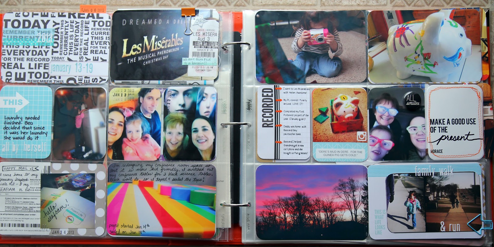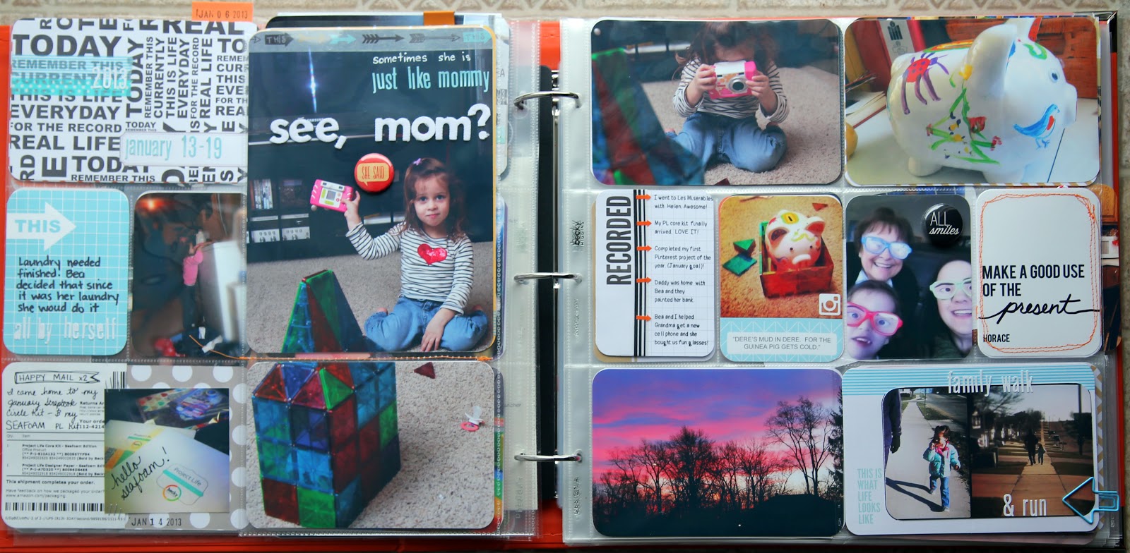 I love the idea of Project Life, or at least my idea of Project Life. I am an everyday scrapbooker. When I am motivated to document something with photos and words, it is almost always something that happens in everyday life, and almost never an "event" (such as a birthday or holiday or reunion, etc.). Project Life, as I see it, is exactly that...documenting the everyday. I especially realized that this might be for me when I did my December Daily 2012. I am loving the memory keeping part of this project.