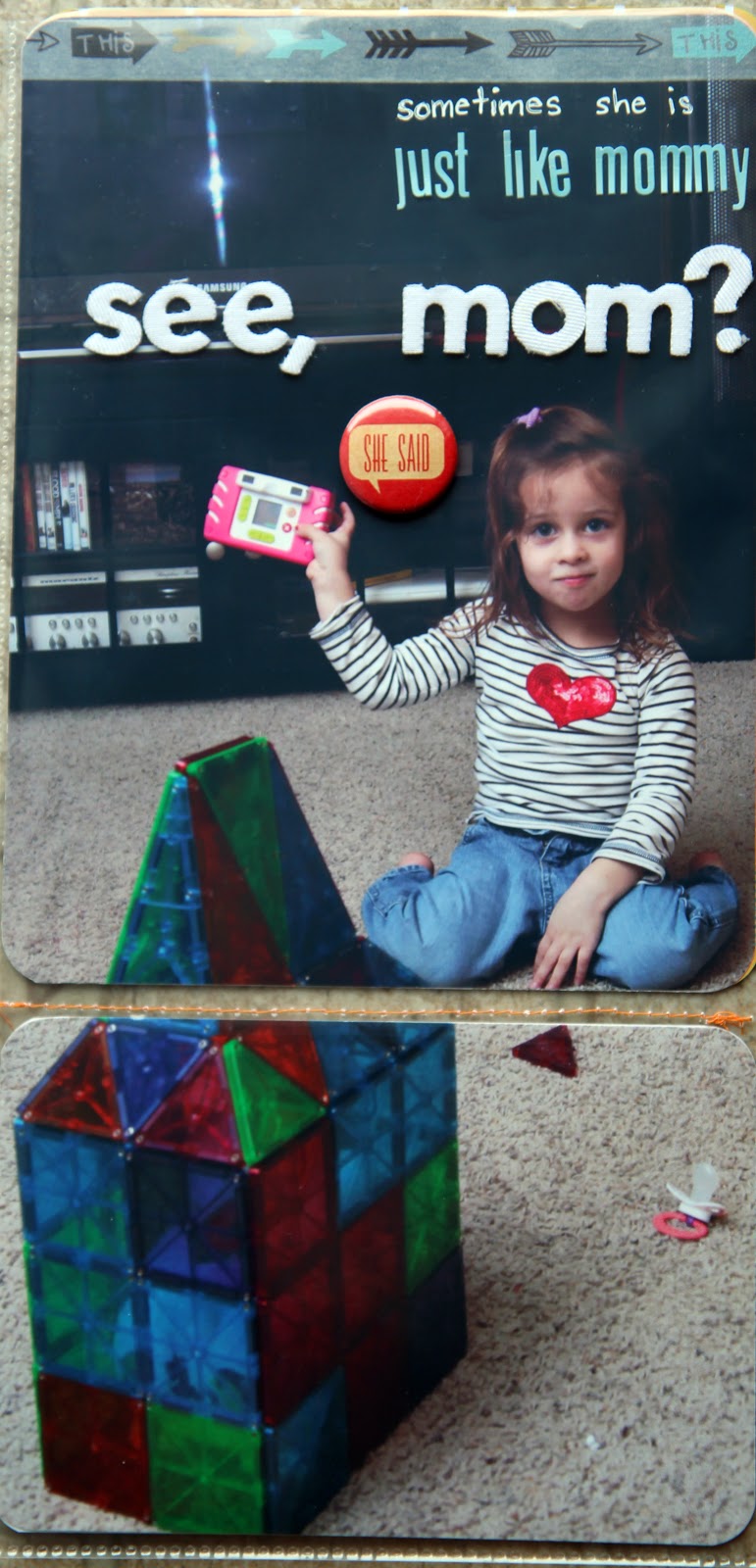 I needed something for the other side of the insert. I had taken several photographs of B. taking photos with her pink camera.  I had a difficult time deciding on which one to add to the book, so I grabbed a second one and cropped it 12x6.  I don't have a printer that prints that size, so cropped that photo into two photos (8x6 and 4x6) so I could print them (and I needed to use them as that size anyway). FUN!  The related photo is right beside the insert, so I put some fun arrow Washi that I got in my January Scrapbook Circle kit, across the top of the big photo, pointing toward the second photo.  I felt like that tied it together a bit.
