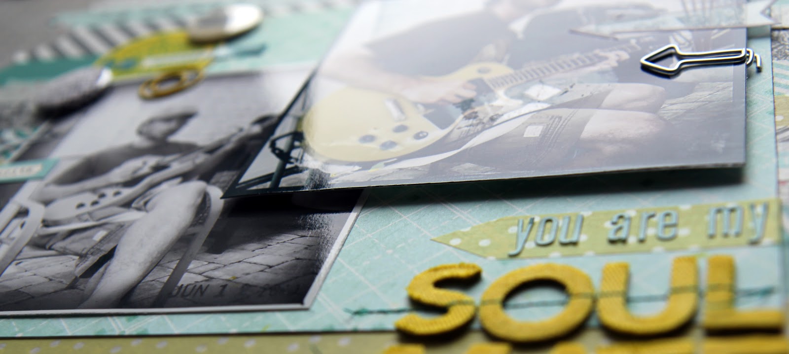 I decided that I would scraplift myself for this one. I started out with this layout as inspiration, but then it kinda morphed into using this one.  I love the colors in this one!  I like the pop of yellow, and how it brings out the gold guitar.