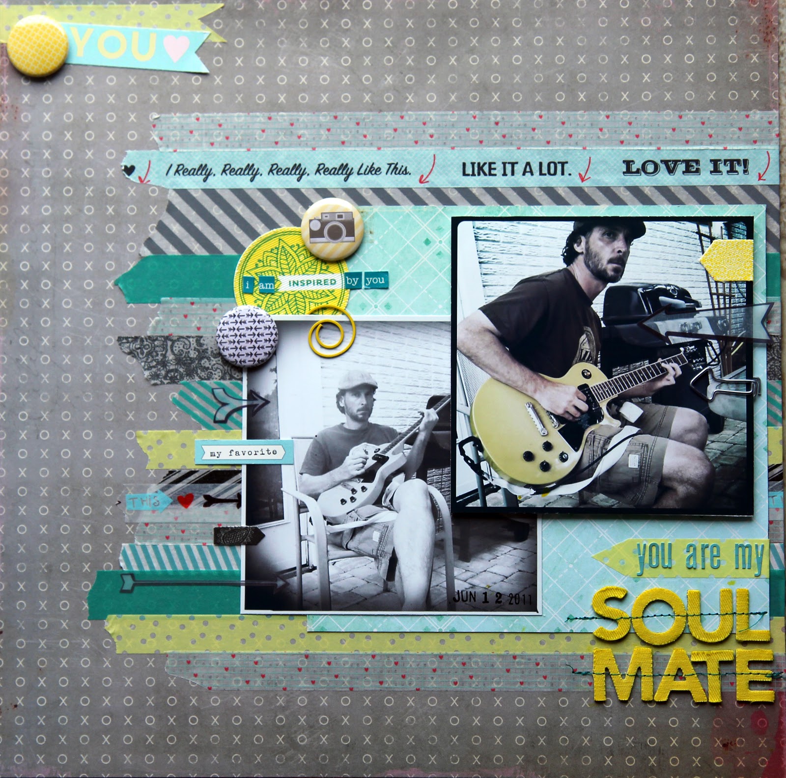 For my second layout, still using Scrapbook Circle's great January kit, I chose a couple of photos from June 2011.  I take TONS of photos of my daughter B. (if you follow me on instagram or facebook, heck, or even this blog, you already know this), but I don't take nearly as many of my best friend, and even fewer of myself.  The day that I took these photos (also my iPhone) he had brought one of his electric guitars outside, but still plugged in (you can see that the door to the house is behind him) and was playing.  It was nice out, B. was playing, and apparently needed an electric guitar as background music.  I so love these moments.
