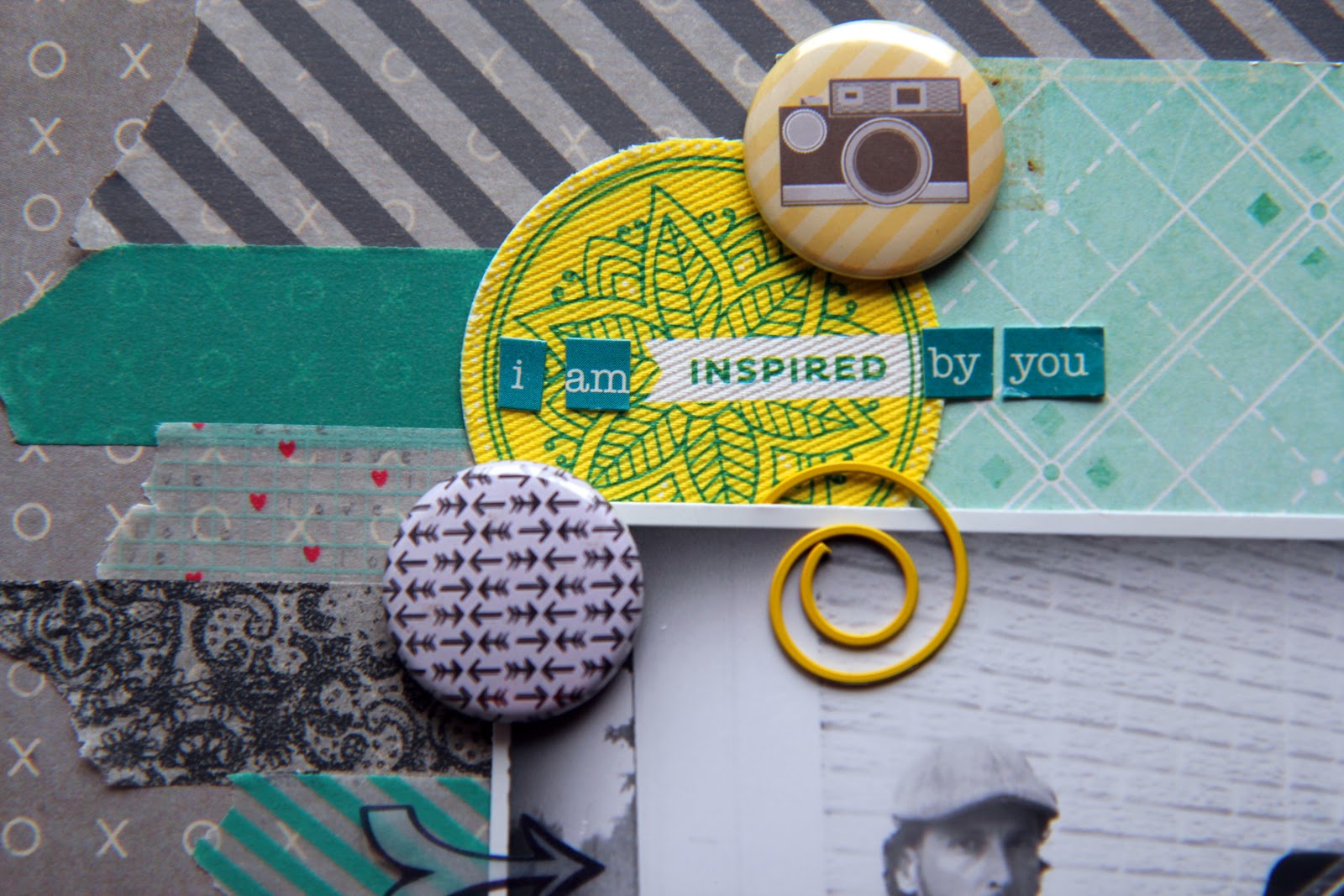 I think the camera flair is American Crafts I think, and the arrow fair (as well as the one in the top left corner) is from A Flair for Buttons (love Shelley's flair).  The "inspired" sticker is Amy Tangerine (also love).