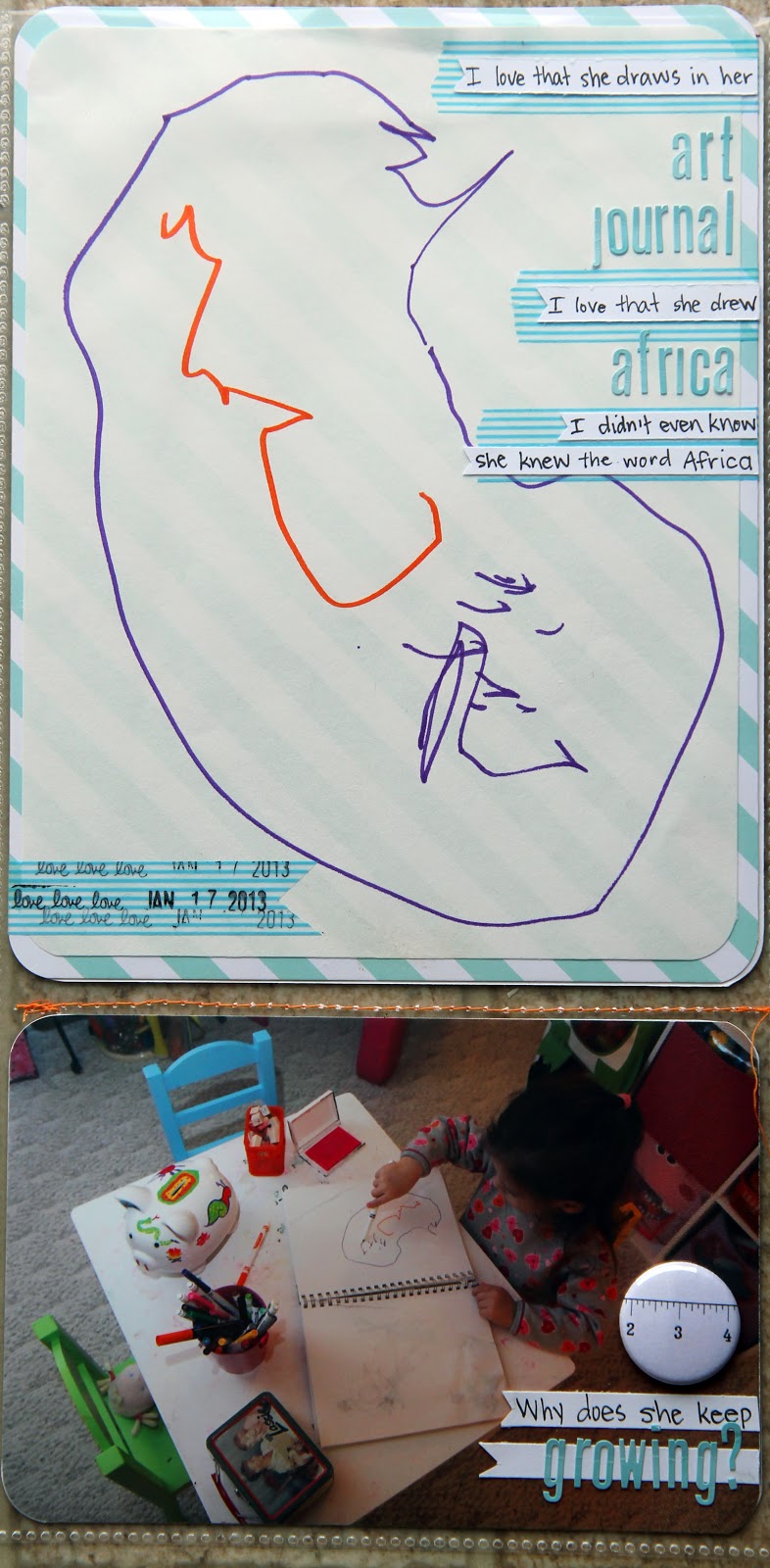 Another insert this week!  This time I used an American Crafts 12x6 page protector, and stitched it a bit so I had an 8x6 spot and 4x6 spot.  Mainly I wanted to add this awesome drawing of my daughter's, along with a photograph that I snapped while she was drawing it.  :-)  Journaling reads: "I love that she draws in her art journal.  I love that she drew Africa.  I didn't even know she knew the word Africa." (and then on the photo at the bottom) "Why does she keep growing?"  For this journaling I used some fun striped washi (that I'm pretty sure is Recollections), and then cut some white strips of paper to write on.  For a little added fun, I trimmed the white strips so that one end looked like a banner.  Journaling this way is my favorite because I can mess up and easily fix it!