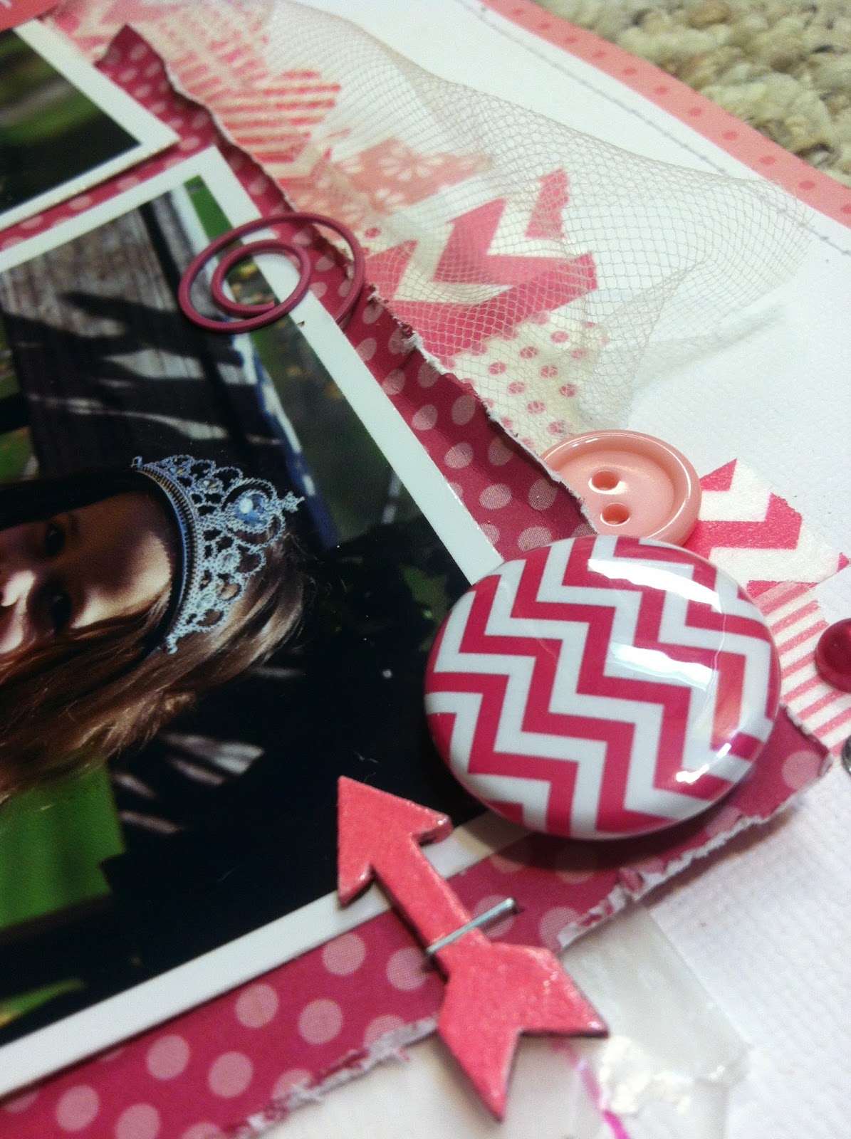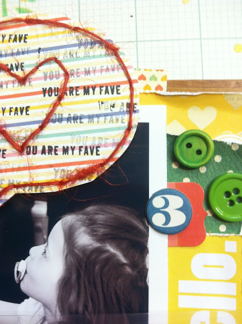 I have the word "favorite" a couple of places on this layout. First I used an Amy Tangerine stamp that I got at Target and stamped "You are my fave" all over a piece of patterned paper. Then I used one of Amy Tangerine's templates to make a speech bubble with a heart in the middle. The second place, also involved stamping. This time it was an Ali Edwards stamp "SUPER favorite" that I stamped over some Elle's studio tags (all supplies are linked below). Most of the rest of the supplies came from the Lucky You Scrapbook Kit by paperissues available here. And of course there is flair from {a flair for buttons}!
