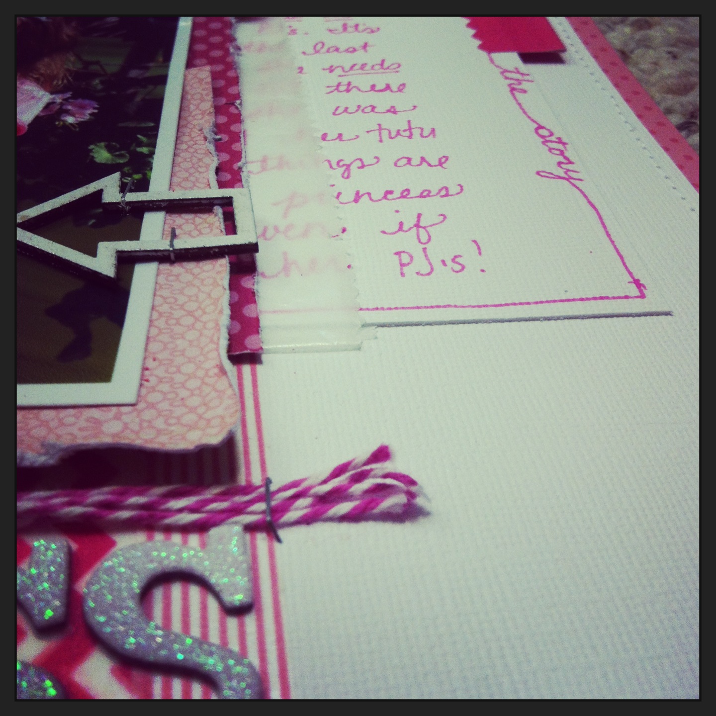 I use stamps all the time now that I get stamps from Ali Edwards (@Technique Tuesday) in the mail every month. They are perfect and totally match my style. This layout was no exception. All of the stamps I used were from Ali. Nearly all of the papers and other materials were found in the May Scrapbook Circle kit : My Favorite. Are these papers fun?! It's early in the month and I've already used most of the papers in the kit! WOW!