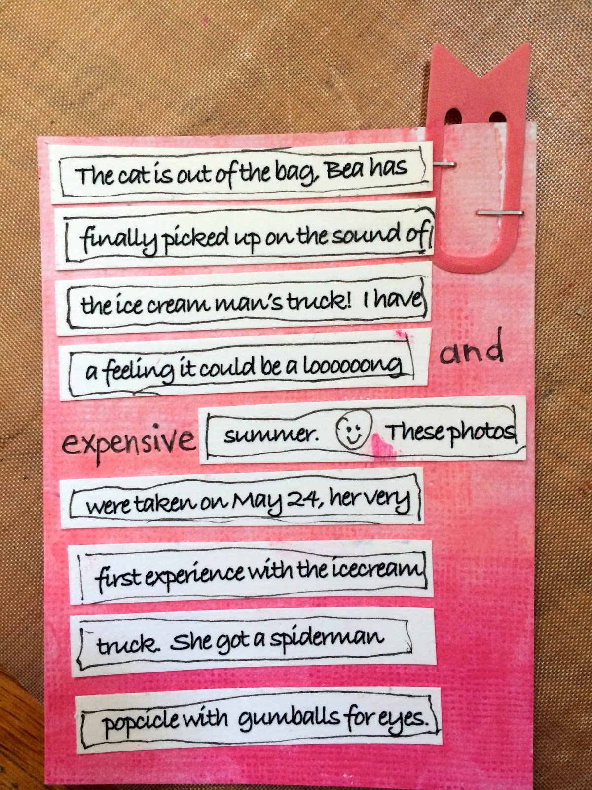 I used Mister Huey spray ink to spray the wood veneer triangles at the top, and then added some white with a white out pen.