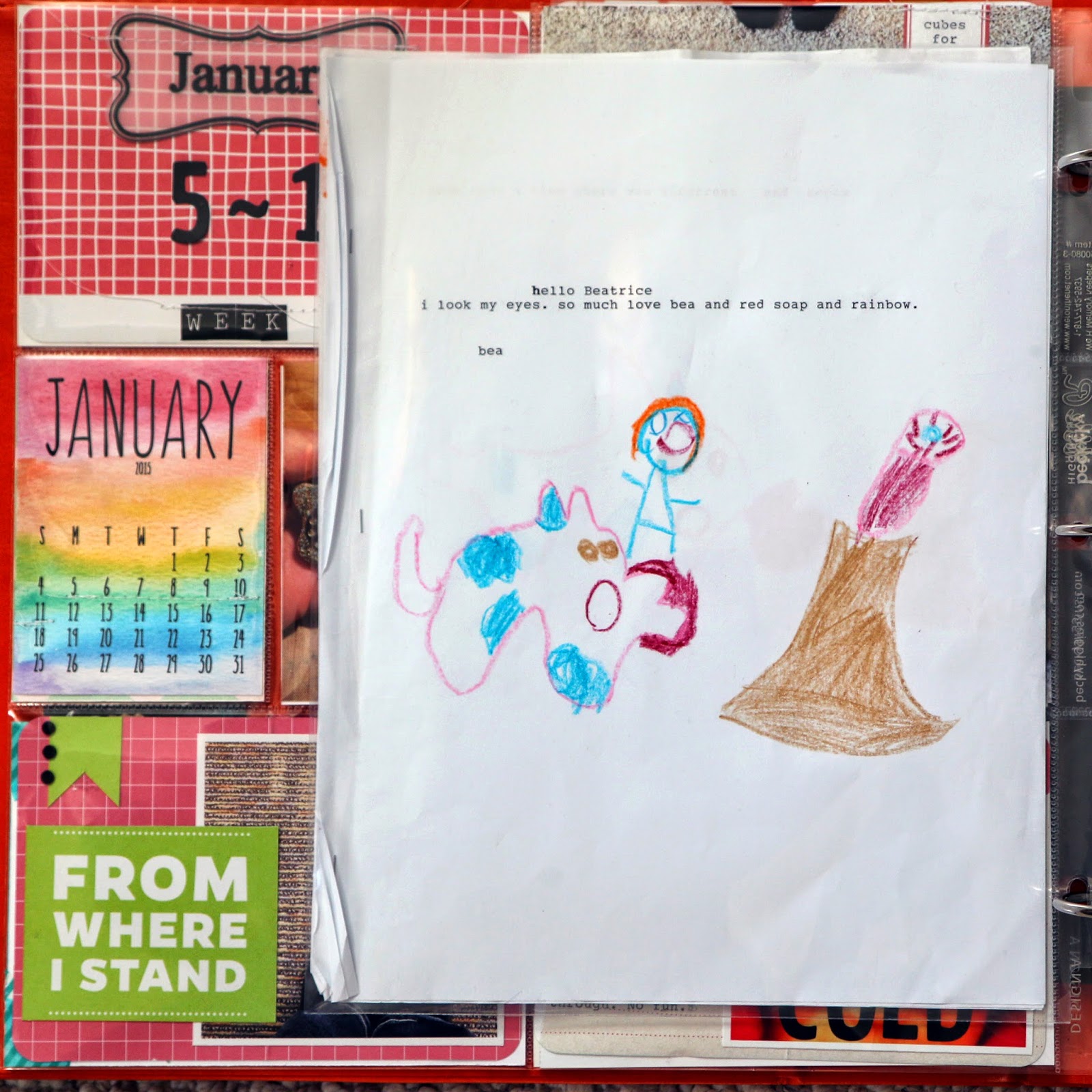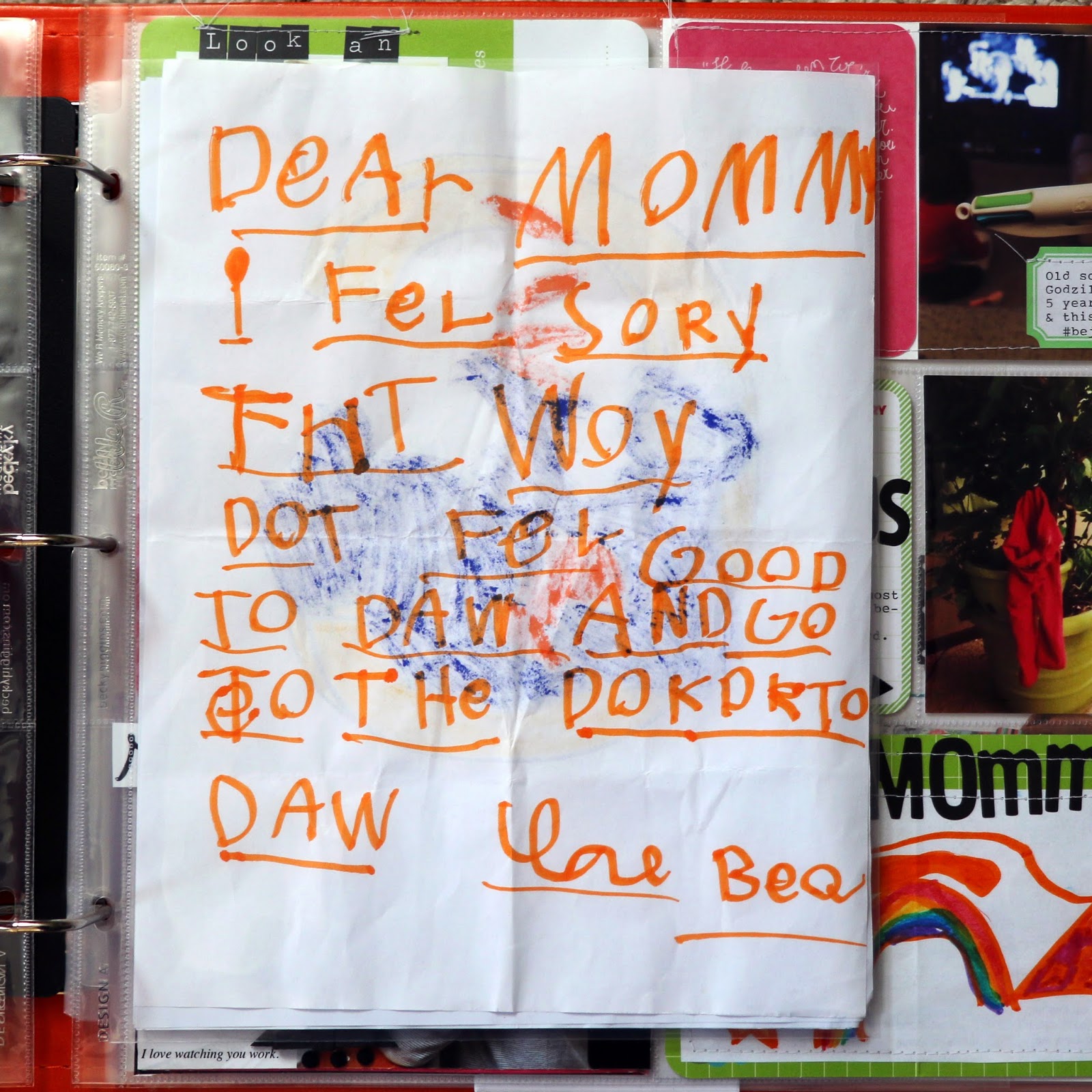 This week I also added a 8.5x11 insert. The front is a letter that B. wrote me when I was sick. I plan on documenting the page with proper spelling, I just haven't decided how I want to do that yet. Dear Mommy I feel sorry that you don't feel good today and go to the doctor today. Love, Bea.