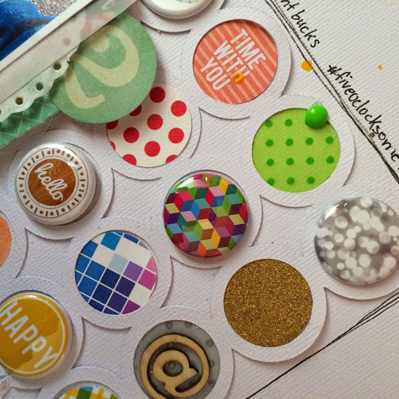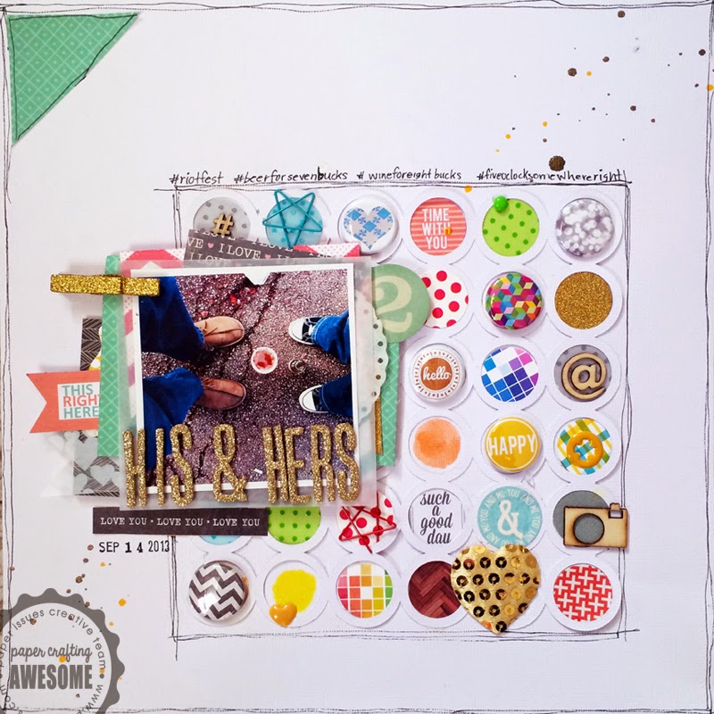 This layout started with the multicolored flair you see above. I saw it, and went with it. Lots of color. Lots of circles. Lots of fun do dads from past Swag Bags.