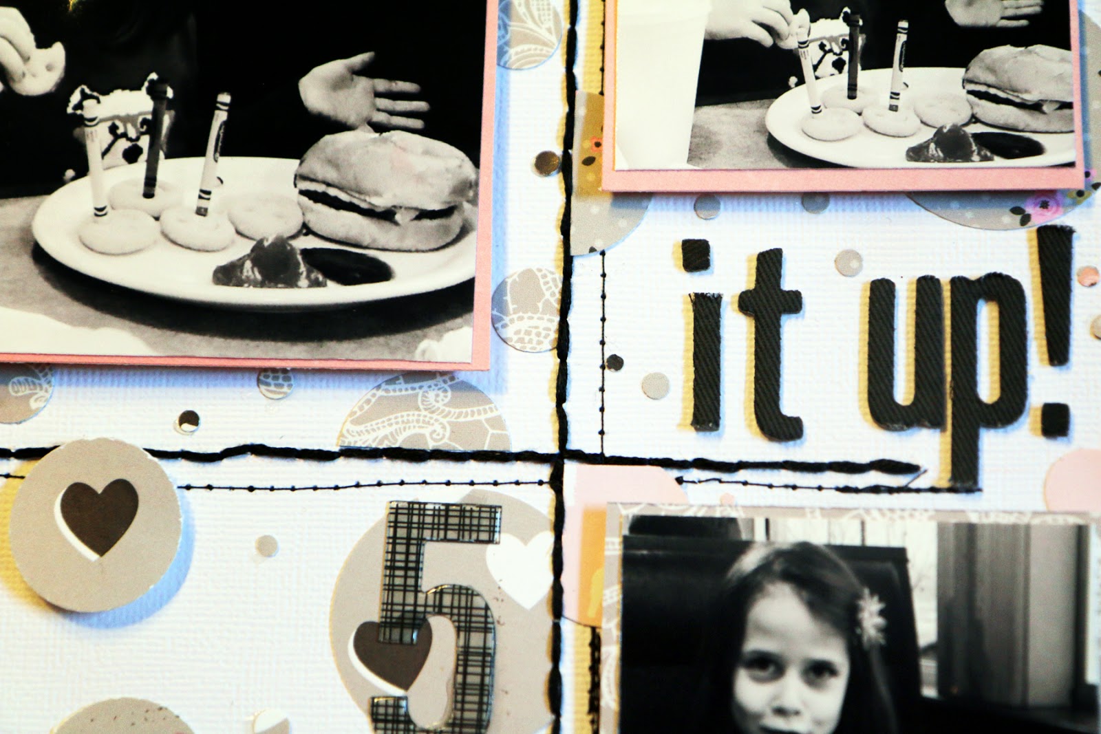Who doesn't love a good grid??? I used both machine stitching and hand stitching to create my grid first, and then I got out my photos, some Pink Paislee Bella Rouge scraps (that's all I have left, I may need to get more from the Paper Issues Store soon) and a couple of circle punches.