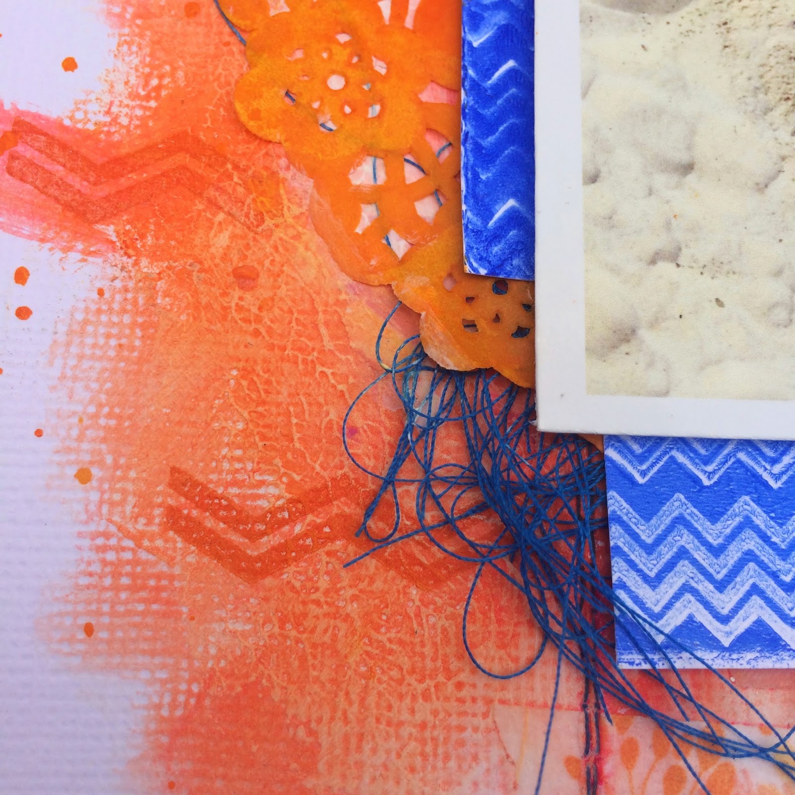 I used some orange, yellow and red gelatos to create a layer under the photo. Then I added the stamping over that with orange StazOn ink.