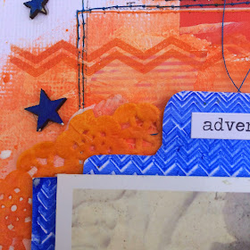 I used some orange, yellow and red gelatos to create a layer under the photo. Then I added the stamping over that with orange StazOn ink.