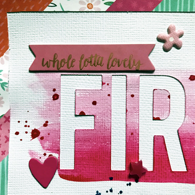 For this layout I used items from Shimelle's most recent collection Little by Little. I fussy cut those circles out -- and stitched them down with my machine. But before that I used my Silhouette Cameo to cut stitching holes for my title! So fun! Here are a few close ups!