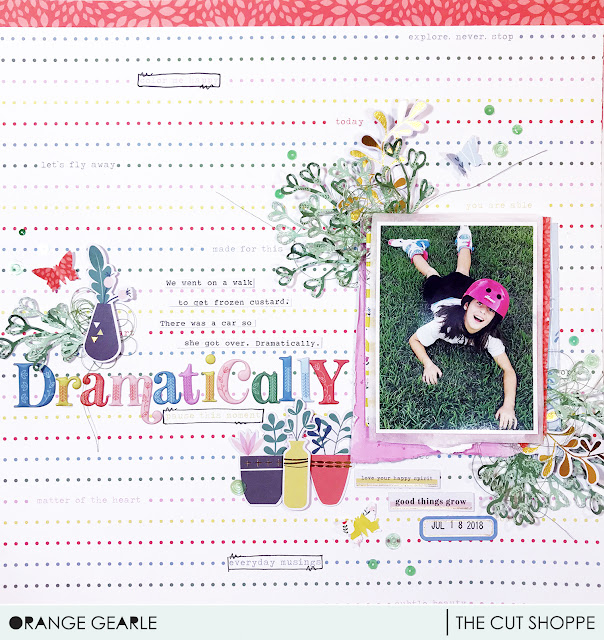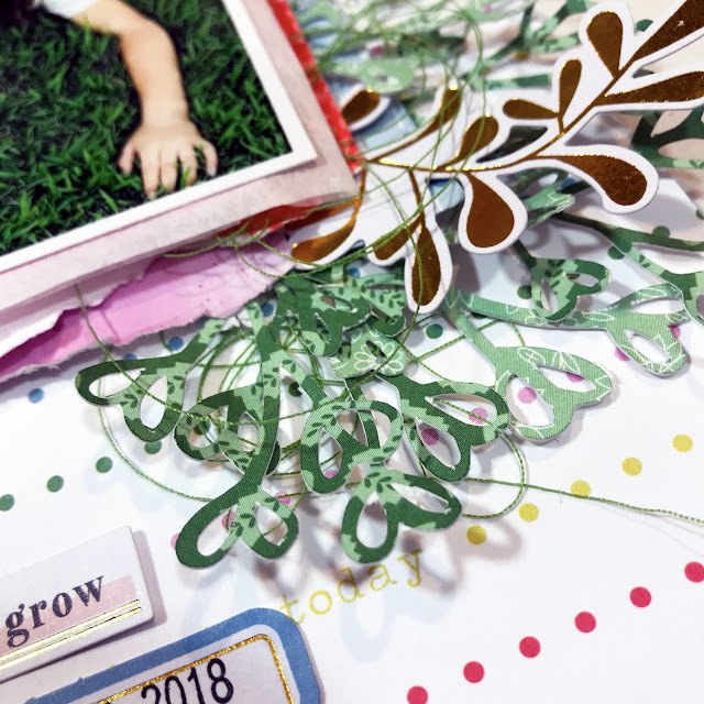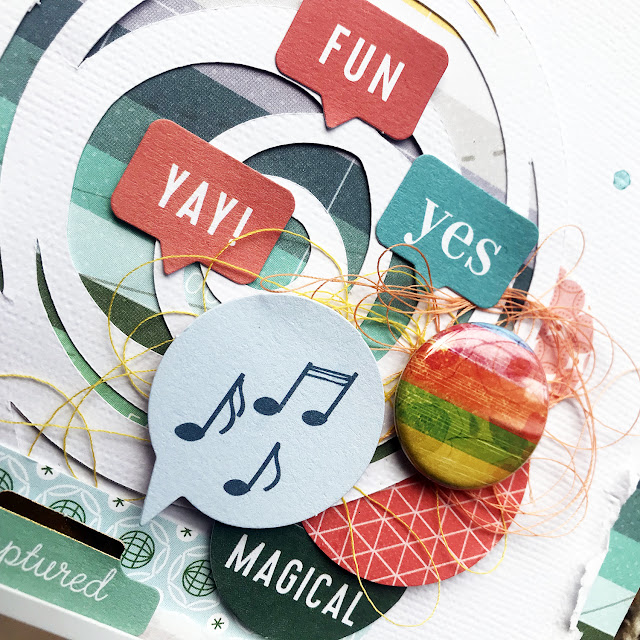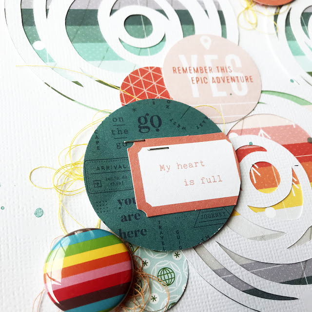 The cut file inspired me to find all the circles and add them to my layout! I used a few different sizes of circle punches, as well as circle embellishments to add clusters of circles throughout the page.