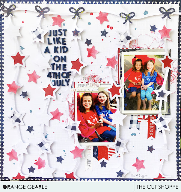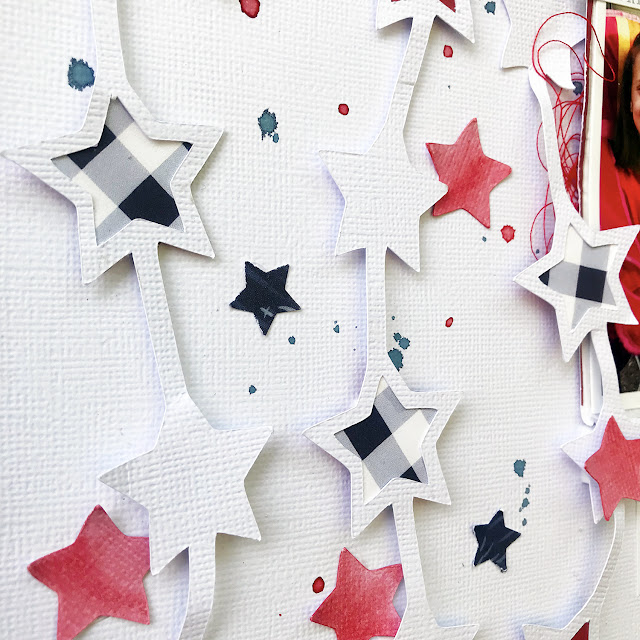 The Pinkfresh studio paper from their Office Hours collection had tons of circles on it -- so I punched them out as well using my 1, 1.5, and two inch paper punches. I also punched some tiny circles that I'm going to guess are 1/2 inch or smaller! I splattered some inks for pops of color, and then I sprinkled the circles across the page and added my flair! I mean you cannot have a circle layout without flair, right?