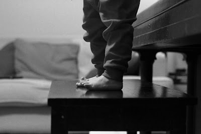 here). I must admit that I am already just taking random, unplanned shots that may or may not work! That's not a good start to the year! Day two was going to be me standing on my piano bench in brightly colored socks and PJ bottoms. However, B kept climbing onto the bench! So, for the first