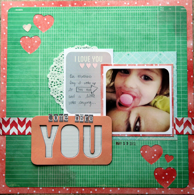 I kept this one pretty simple (didn't even use my sewing machine or any washi on this one), but I like the way it turned out. Journaling reads : "On Mother's Day I woke up to this hug and a little voice saying Come Here You". It's a true story, yo -- she is that awesome!