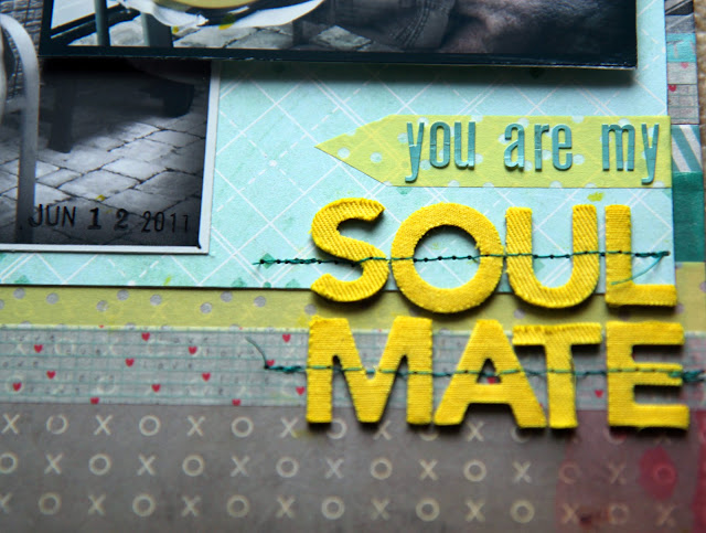 My favorite alphas right now are pretty much any of the 12x12 abc stickers from Lily Bee Design. I believe these come from the Picket Fence Collection, but I've purchased about as many of these different sheets as possible, I love them! I've used them a lot for PL, they are the perfect size. I used DIY Thickers for "Soul Mate", and misted them with Mister Huey's "taxi" mist and then secured them with a little stitching, just in case).