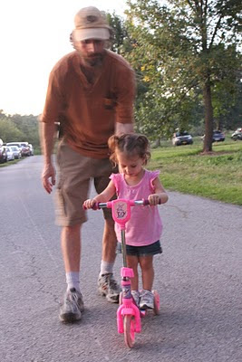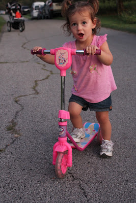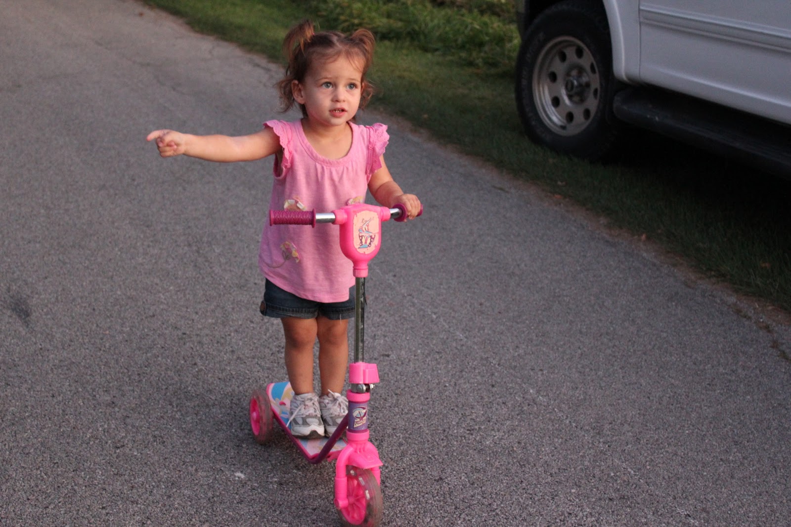 We took our hand-me-down scooter with us.  She didn't do too bad!  We should get out that helmet, though!  Daddy helped push, but she was also able to scoot herself a long a bit.  Steering is still an issue!