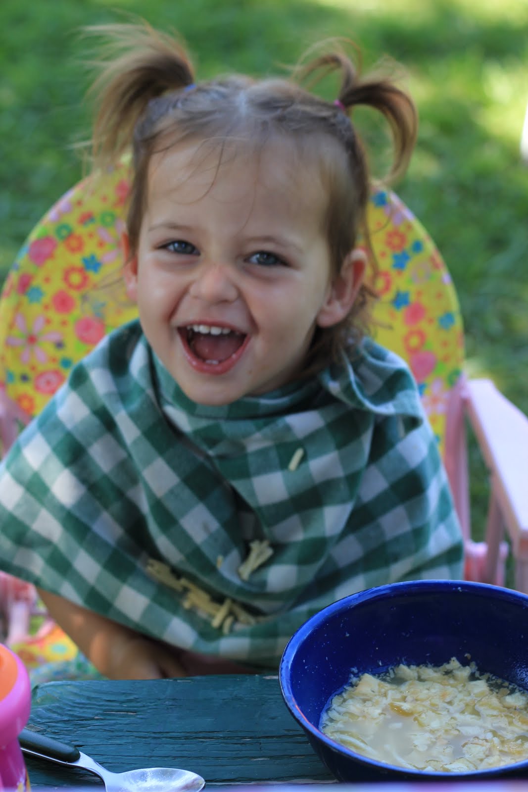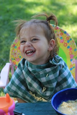 Believe it or not, some of the noodles did get into her belly!  The smiling is partly because of the "yummy in her tummy", but mostly because Daddy is making faces!