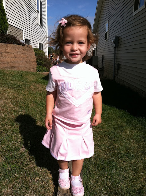 Charlie is on his second round of antibiotics, steroids, cough medicine and now and inhaler.  I'm feeling much better, but this cold has been nasty!  We've pretty much had the plague at our place since school started!  Luckily, the worst of it has stayed away from B.  She has a little cough and a slightly runny nose, but mostly it seems like allergies for her.  This is how cute she looked on Friday, Sept 9, in her Pink Hawkeye cheerleading outfit!  Isn't she big???!!!