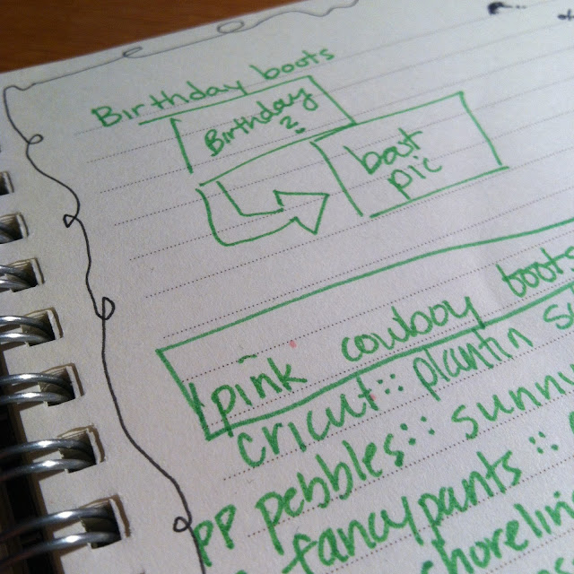 A while back I started a notebook to help me with the memory keeping process. The whole idea of it was to write down the stories that I wanted to tell. Often times I put the date of the photos, a description and then the text that I think I will use. It's evolved into a place to practice a technique (here I was practicing doodling), get a sketch idea down (I ended up using this one, but flipped it because my arrow stamp went the other way), practice my journaling, and I also document all the supplies that I use so it's easier to blog.