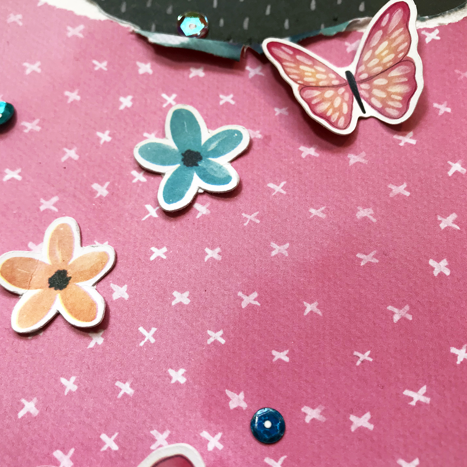I fussy cut those butterflies from a sheet of 12x12 paper in the kit. I love how it turned out! Do you like the rainbow trend? Well, that's my challenge for you! Make a rainbow in some way on your layout and share it with us in The Clique FB group! Here are a few close ups.